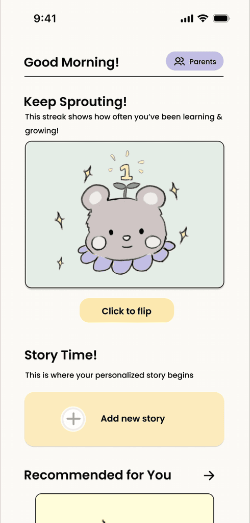 Designed an inclusive, easy-to-navigate interface with accessible colors and friendly branding. Created interactive AR characters and camera filters with gesture recognition to make social stories engaging yet calming for children, while keeping the experience simple for parents to use.